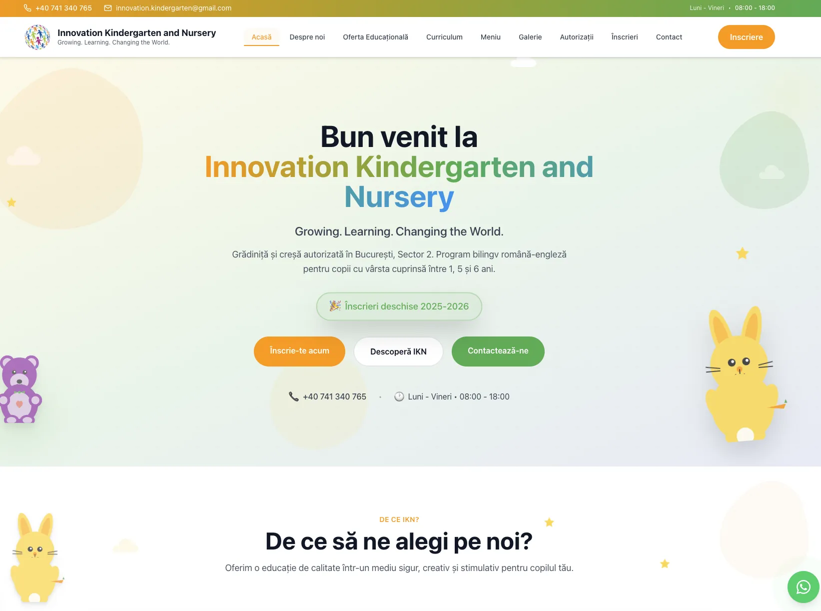 Website complet pentru Innovation Kindergarten and Nursery, grădiniță și creșă autorizată în București, Sector 2. Design jucăuș și colorat cu animații avansate, admin panel complet pentru gestiunea galeriei, meniului săptămânal, mesajelor și serviciilor. Optimizare automată imagini, formular contact cu validare, GDPR complet cu audit log și buton WhatsApp pentru contact rapid.